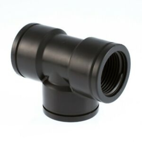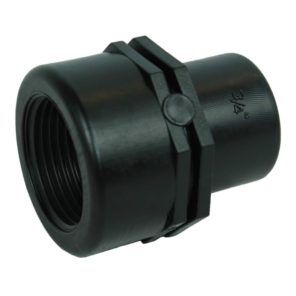 Conexión roscada hembra de polipropileno (PP) para tuberías de HDPE. Fabricada con materiales de alta calidad, es resistente a impactos, corrosión y rayos UV.