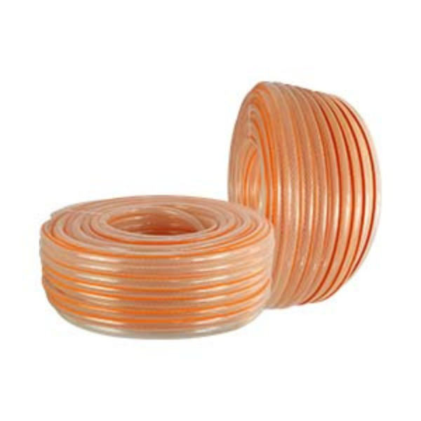 Manguera de gas de alta presión de 1/4" de diámetro y 1 metro de largo, fabricada en PVC negro con refuerzo de poliéster naranja. Ideal para instalaciones de gas doméstico y comercial.