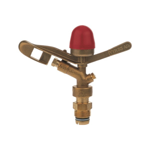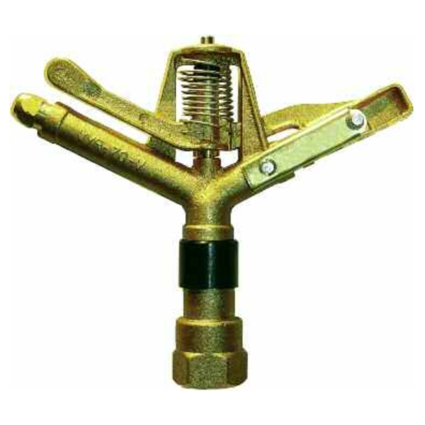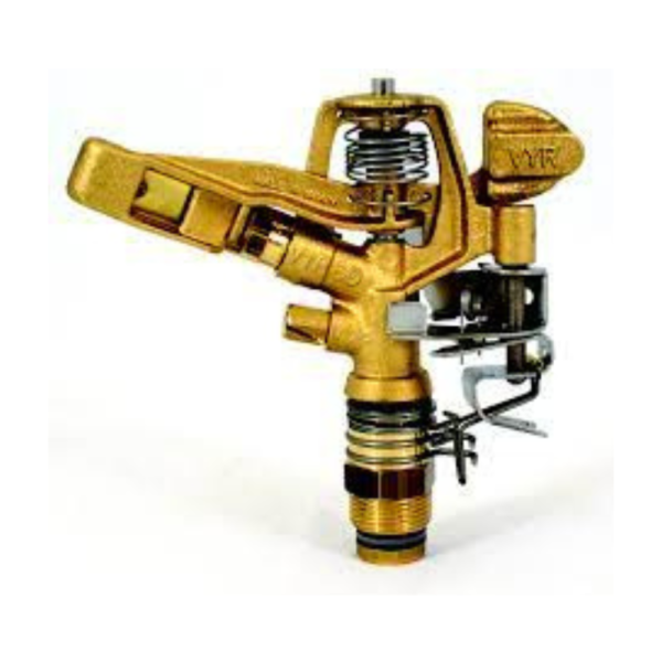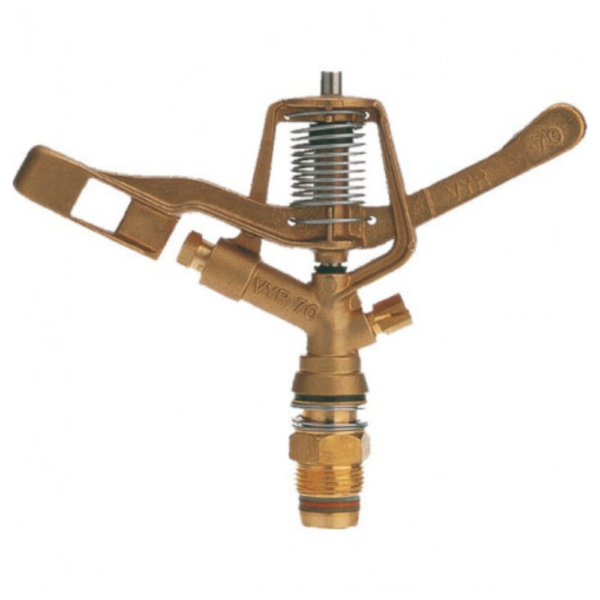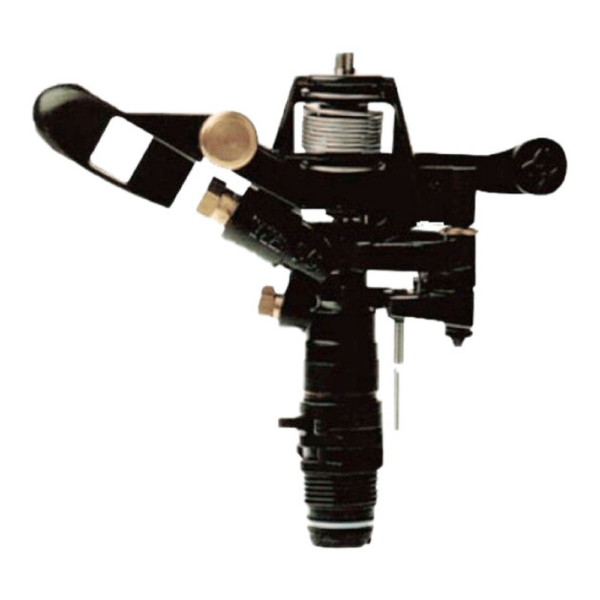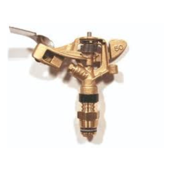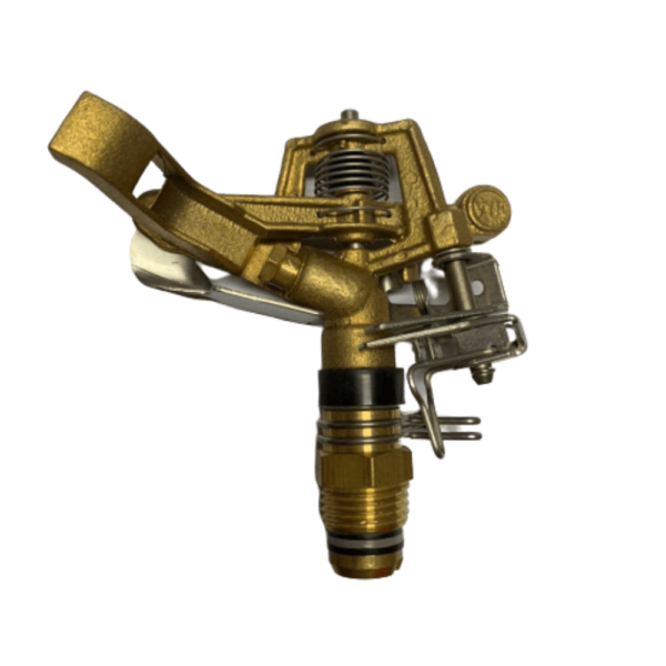 Aspersor de impacto aéreo fabricado en latón y acero inoxidable, con conexión 1/2" macho. Ideal para riego por aspersión en agricultura, jardinería y floricultura.