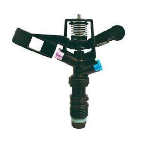 Aspersor agrícola circular de bajo caudal y ángulo variable, fabricado en plástico de alta resistencia. Ideal para riego de cultivos en huertos, invernaderos, campos de golf, etc.
